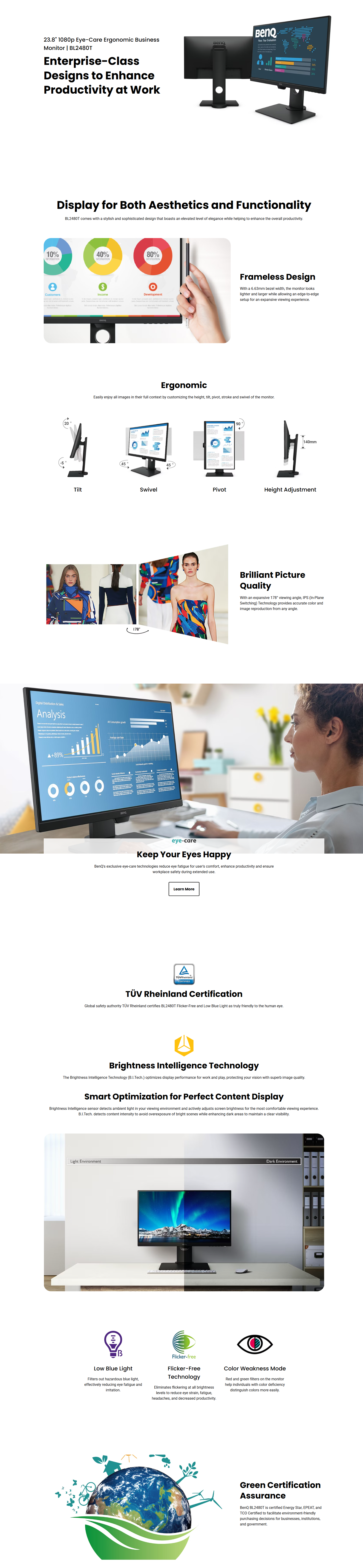 BenQ 23.8 Inch 1080p IPS Full HD Business Monitor, Ultra Slim Bezel, Black - BL2480T