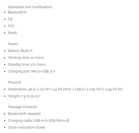 Make and receive phone calls with the Manhattan Bluetooth® Headset. This helpful, wireless in-ear device comes equipped with an omnidirectional microphone that ensures clear communication. When you are not busy on a call, it lets you stream GPS directions, music and podcasts from your phone just as well. With up to 10 hours of use and up to 170 hours of standby time, you can make reliable calls throughout the day on a single charge.