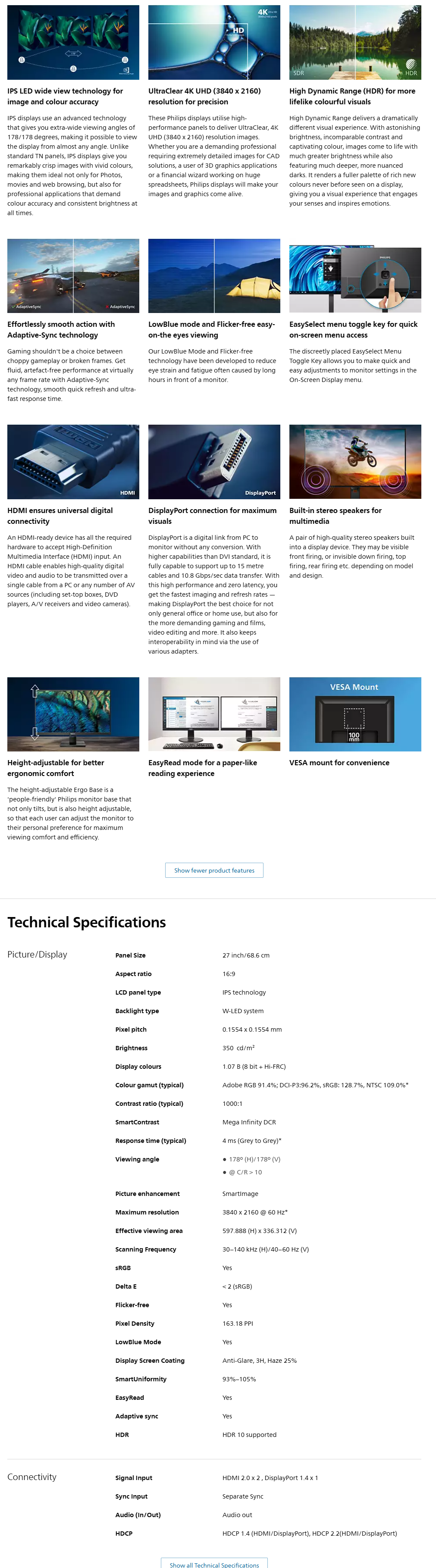 PHILIPS 27" Ultra HD monitor, speakers, height adjustable, HDR10 (3840x2160, 60 Hz, HDMI 2.0, DisplayPort 1.4) black - 27E1N1800AE